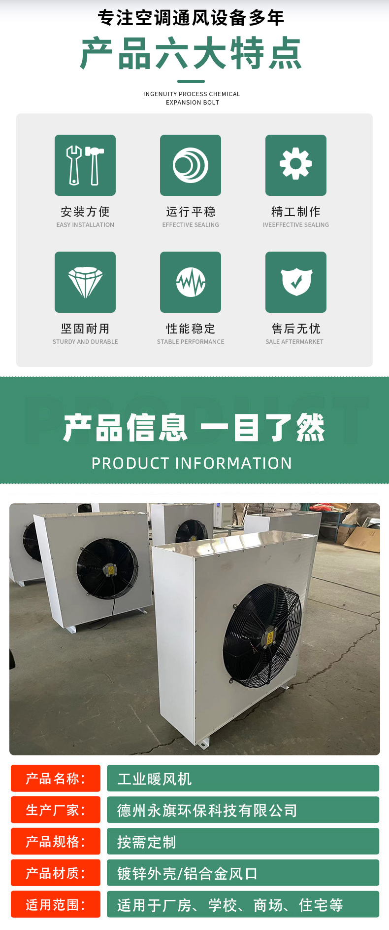 专业生产高大空间冷暖机组,边墙风机,暖风机,空气幕风幕机,轴流风机,风机风阀,风管等中央空调末端系列产品